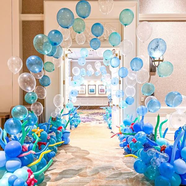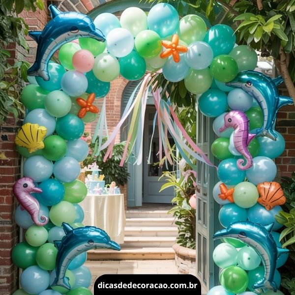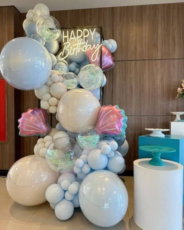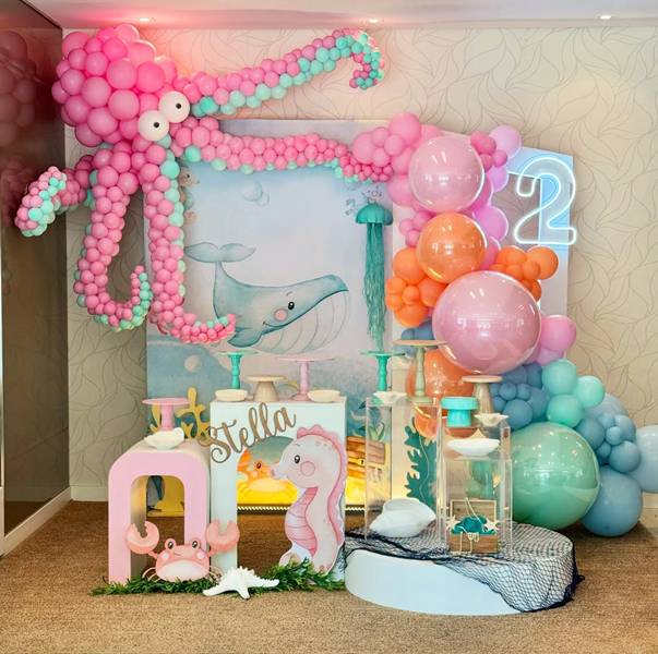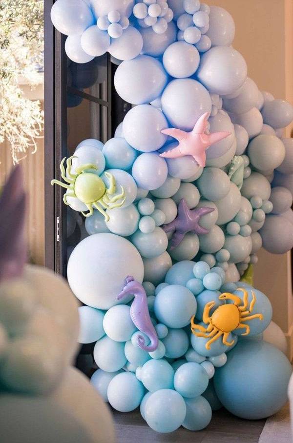 18. Junto aos balões convencionais que são esses redondos em diferentes tamanhos, pode adicionar ainda balões de acordo com o tema, em formato de estrelas e até cavalo-marinho, entre outros.