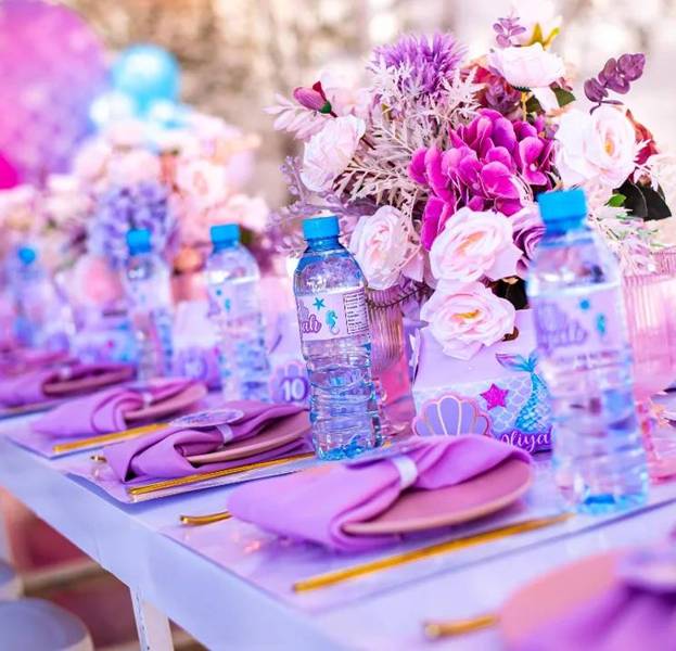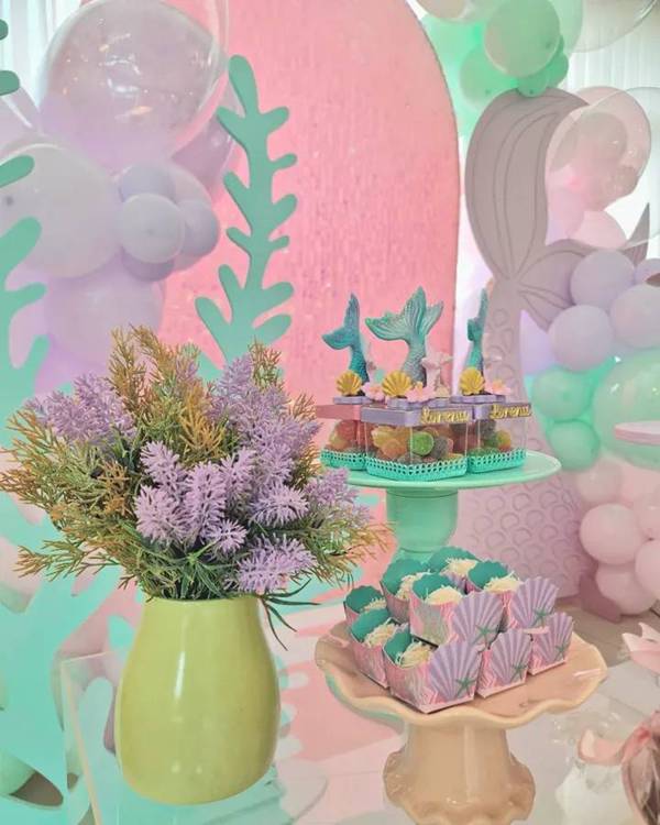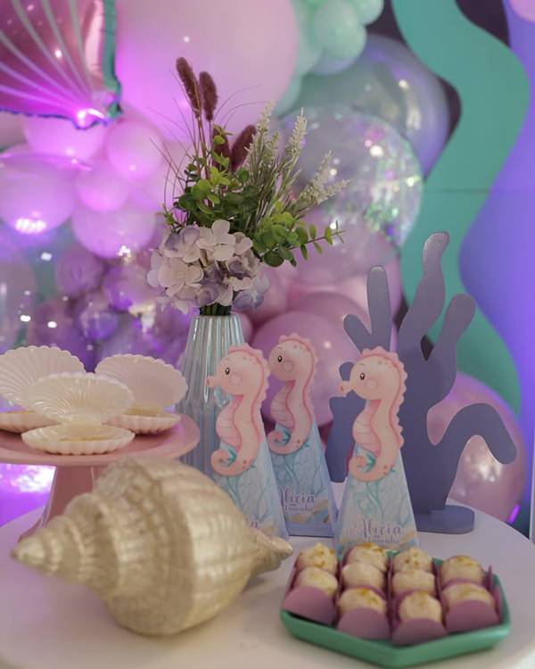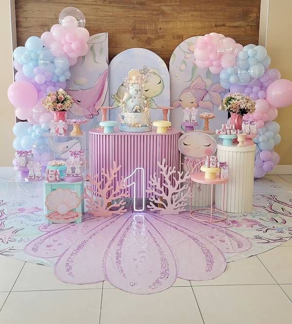 36. No caso da decoração de fundo do mar em mesa de aniversário de menina. vemos mais uma vez como as cores rosa e lilás acabam se destacando!