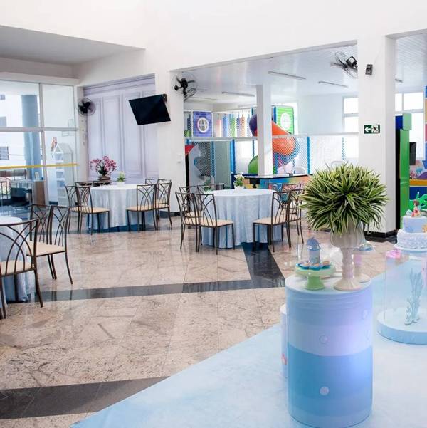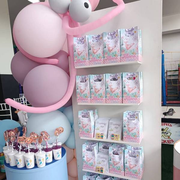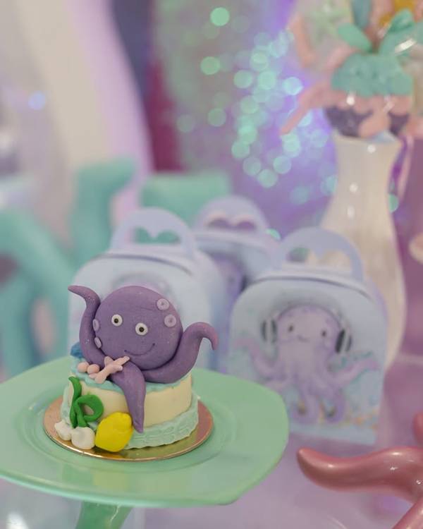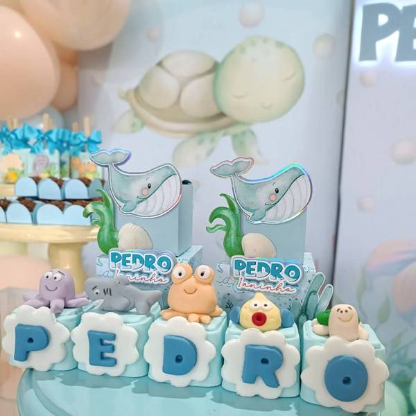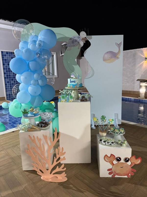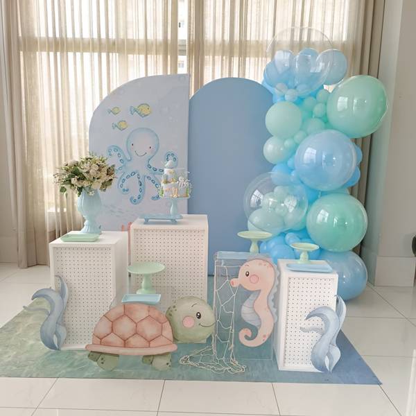 9. Na montagem do espaço, podemos destacar a presença das figuras dos animais marinhos, que aparecem em um formato mais fofo para combinar com o evento infantil.