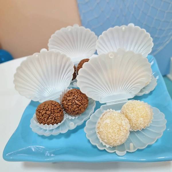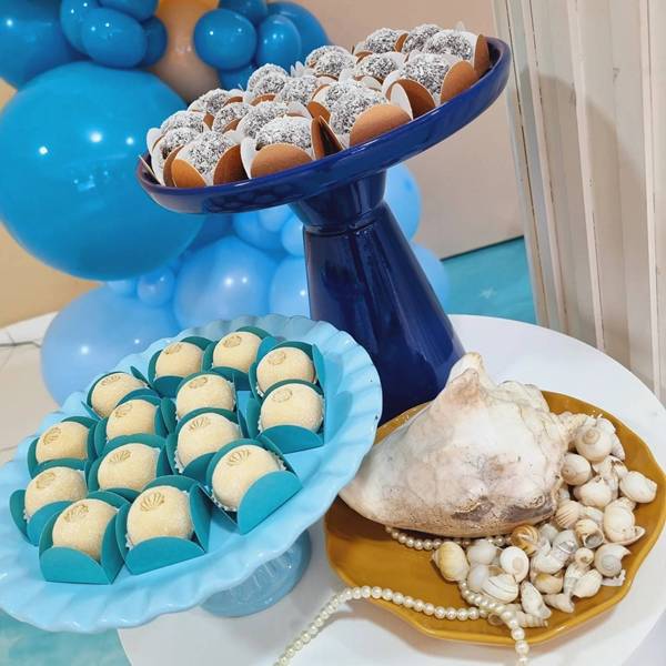 40. No caso da decoração dos meninos, trouxemos alguns doces colocados em concha, e aqui acontece a mesma coisa.