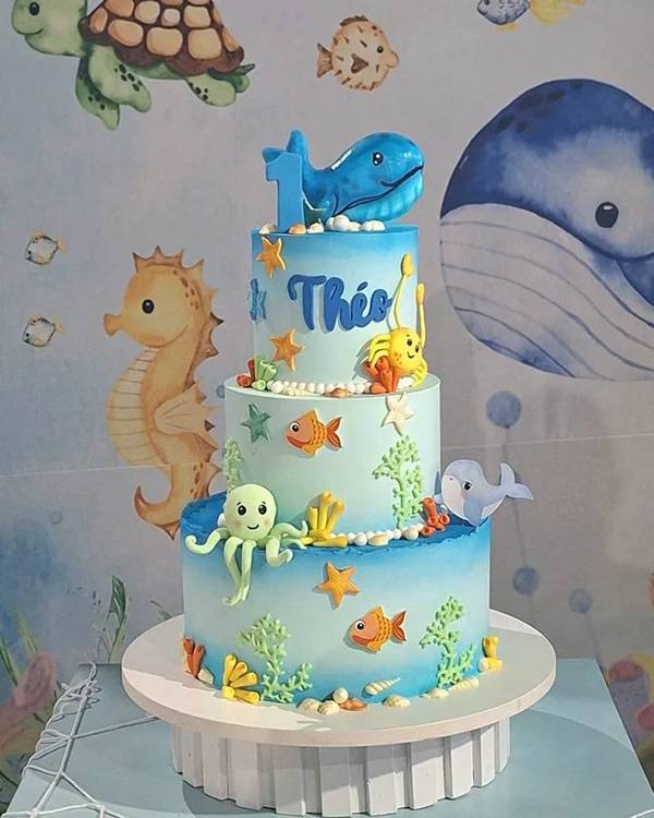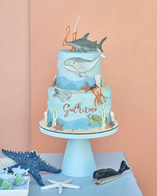 46. Para a decoração de fundo do mar pensada para os meninos, o bolo azul se torna comum, sendo inclusive esse o tom que o mar costuma apresentar.