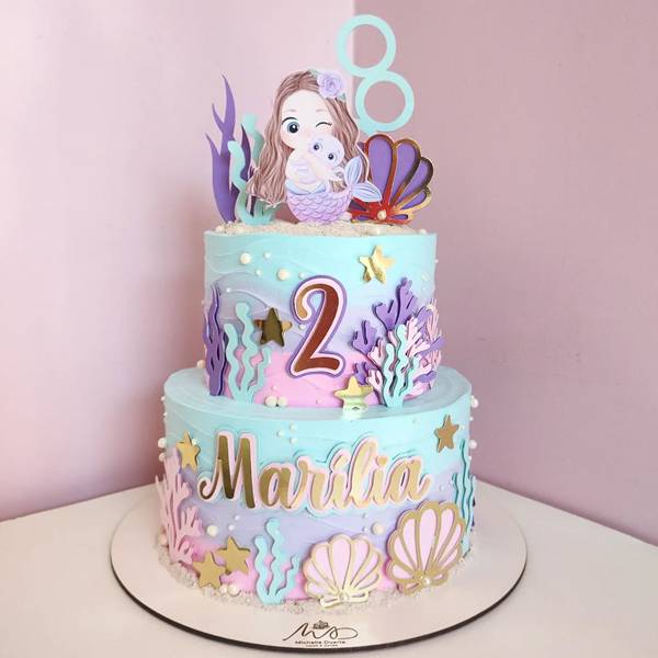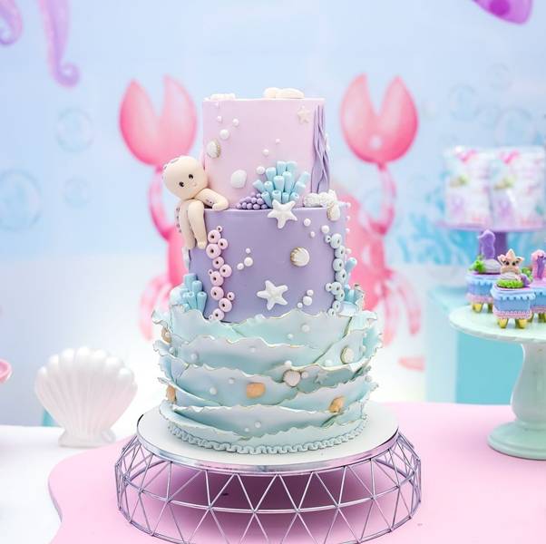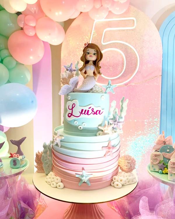 51. Aqui, os tons utilizados foram lilás, rosa e azul, todos de forma bem clara e sutil. Já no topo, aparece uma sereia!