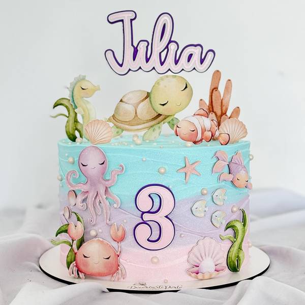 50. Os bolos de fundo do mar pensados para as meninas, apresentam como diferencial o uso de tons mais delicados, assim como figuras mais fofas, em um estilo baby.
