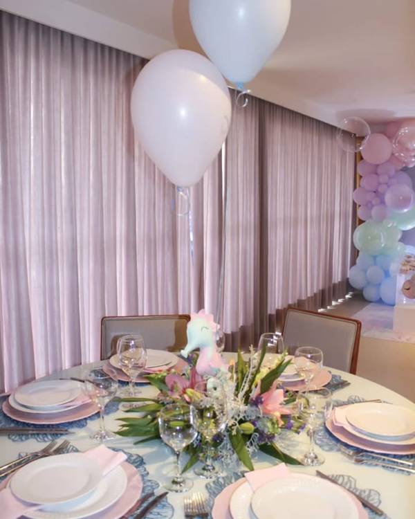58. Se a decoração de fundo do mar for rosa, essa é a cor que deve ganhar foco na mesa, por meio de elementos como flores decorativas e até guardanapos.