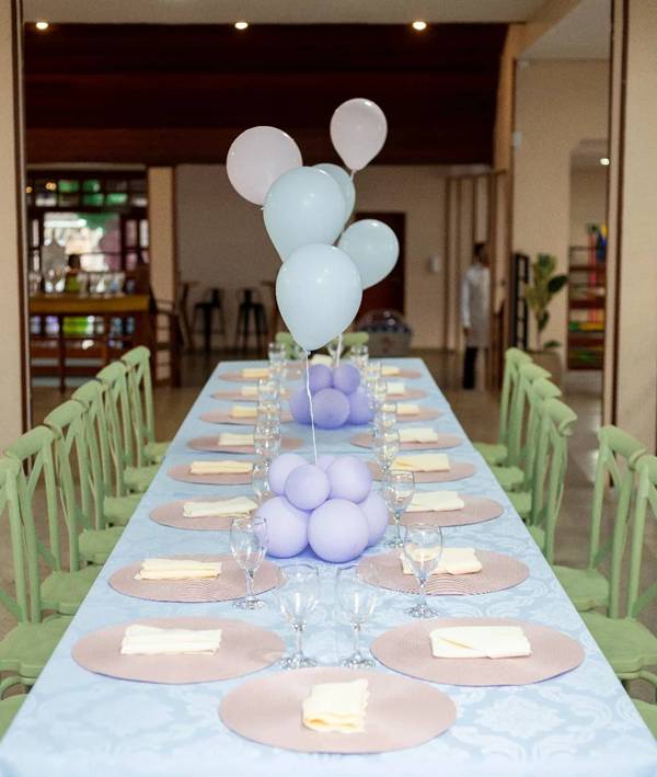 57. A seguir, como a decoração foi idealizada em tons de azul, essa também se tornou a cor selecionada para a toalha de mesa usada na mesa dos convidados.