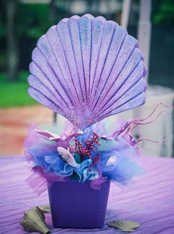 65. Neste modelo, vemos uma concha em tons de lilás e roxo. Para fazer de forma artesanal, pode usar materiais simples como o EVA.