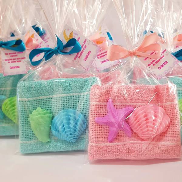71. Seguindo com as ideias, vemos essa sacolinha com toalha e sabonetes em formatos relacionados ao fundo do mar, como é o caso do modelo de concha.