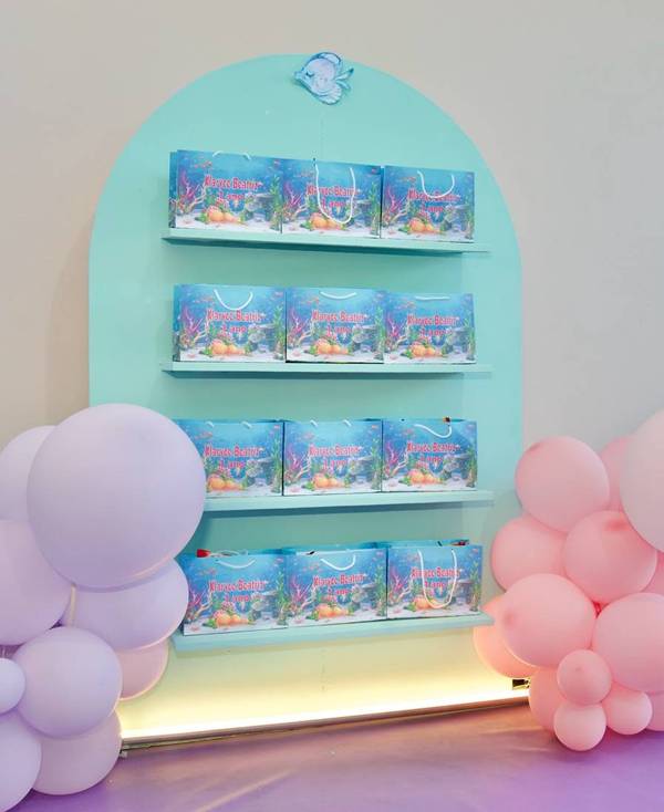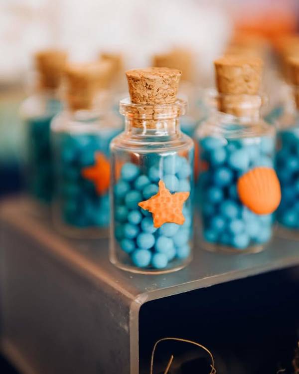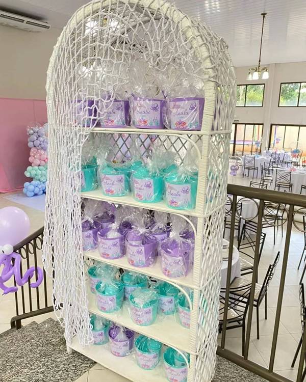 76. E não se preocupe, há muitas maneiras de organizar as lembrancinhas como parte da decoração de fundo do mar, gerando um espaço bem organizado e bonito para elas.