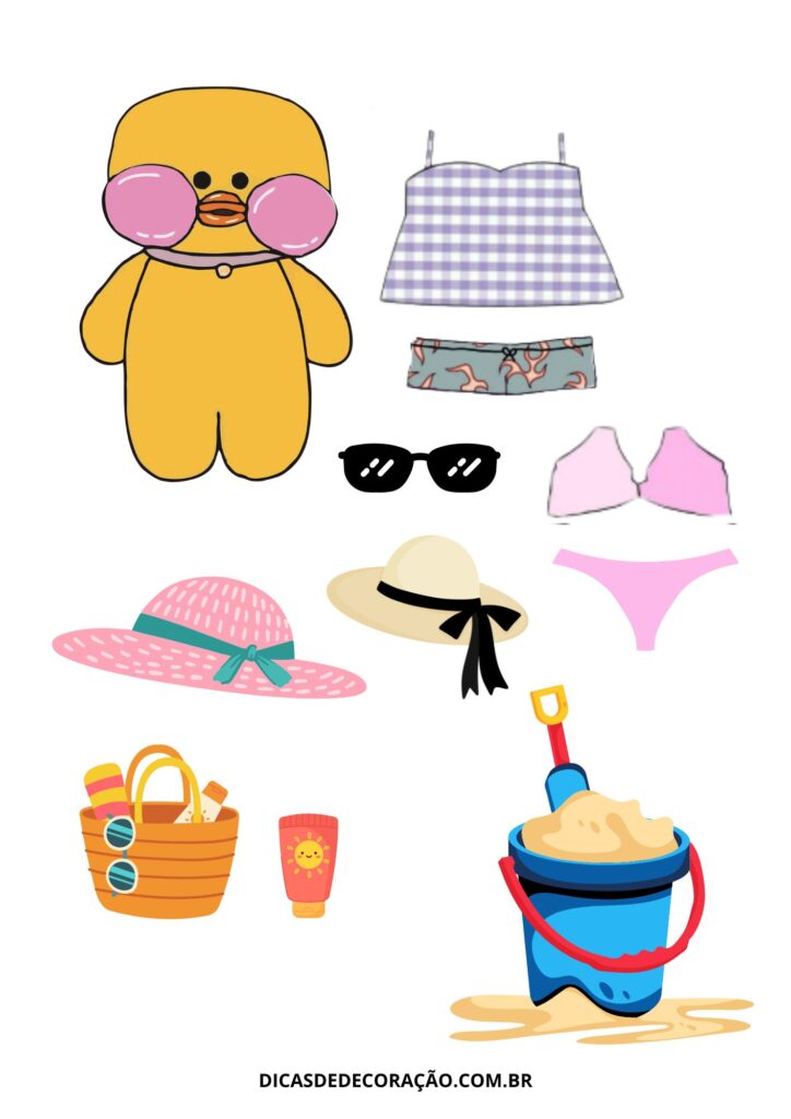 10. Com cenário de sol, mar e diversão, o pato na praia é ideal para brincar com looks de verão, baldes com areia e claro, o clima de férias.