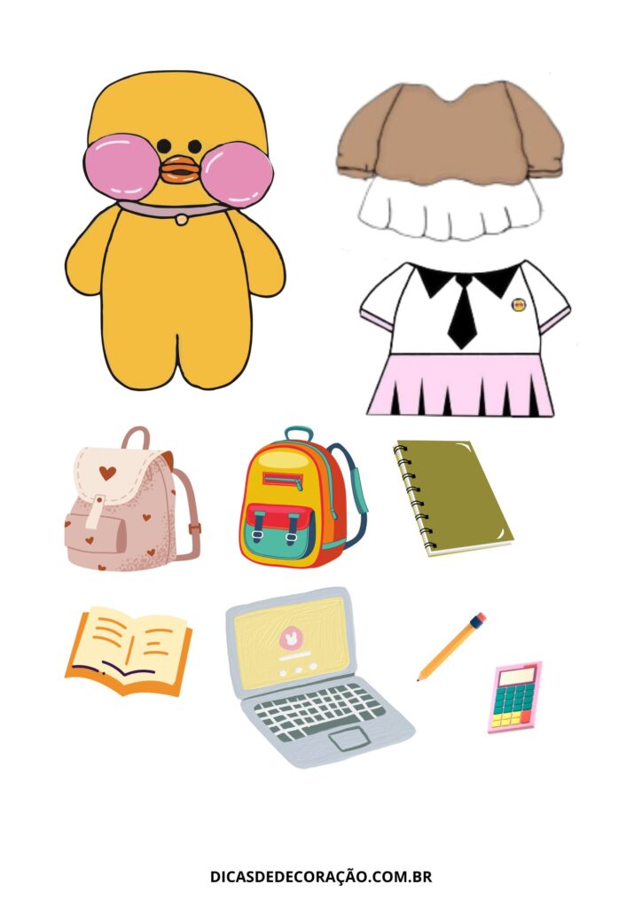 14. A rotina escolar vira brincadeira com esse modelo do pato na escola. Ideal para ambientar os pequenos e trabalhar itens como mochila, livros e uniforme.