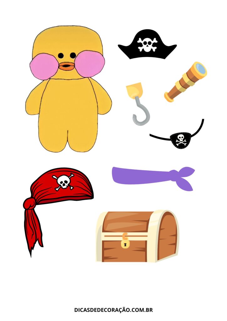 21. Uma viagem pelos mares com o pato pirata. Chapéus, luneta e baú do tesouro criam o cenário ideal para aventuras cheias de imaginação.
