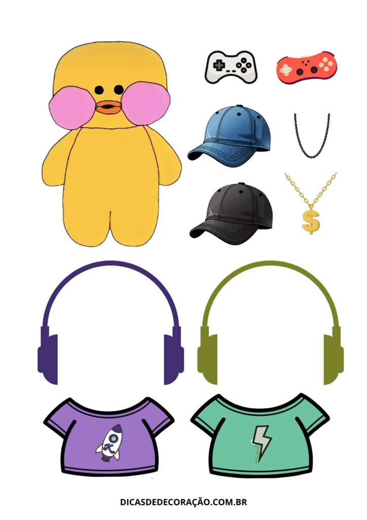 23. Essa opção do pato gamer é ótima para conectar a brincadeira ao universo digital, montando consoles, fones e looks modernos.